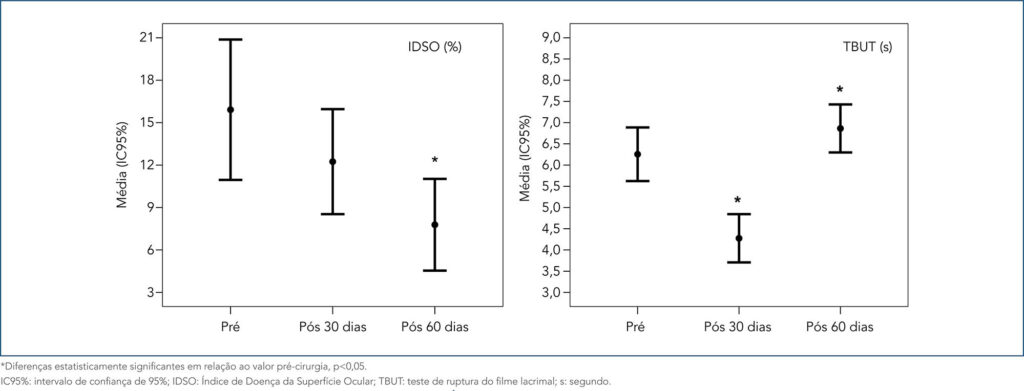 Na análise pré-operatória, 25,5% dos pacientes tinham olho seco pelo critério subjetivo (Índice de Doença da Superfície Ocular ≥ 25%), enquanto a proporção de pacientes com olho seco foi de 92,2% pelo critério objetivo (teste de ruptura do filme lacrimal < 10 segundos). Não houve correlação entre o teste de ruptura do filme lacrimal e o Índice de Doença da Superfície Ocular (r = −0,14; p = 0,33). Não foi observada redução dos sintomas de olho seco (15,9 ± 17,6 versus 12,2 ± 13,2 versus 7,8 ± 11,5; p < 0,001) e nem do tempo de ruptura do filme lacrimal (6,2 ± 2,2 vs. 4,3 ± 2,0 versus 6,9 ± 2,0 segundos; p < 0,001) no pré, 30 e 60 dias após a cirurgia.