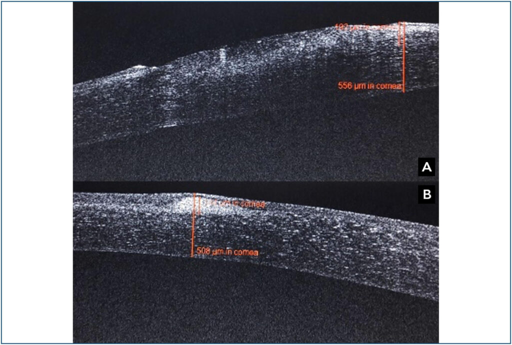 A 65-year-old man with a history of vegetal trauma to his left eye, presented to the emergency room complaining of pain and blurred vision in the right for three weeks. The best corrected visual acuity was 3/10 in the left eye. Biomicroscopic examination showed a conjunctival hyperemia, a large paracentral inferior corneal ulcer, underlaid with stromal infiltrate. A corneal microabscess was detected at 2 o’clock without fluorescein staining. Anterior segment-optical coherence tomography showed the inferior epithelial defect underlaid with a hyper-reflective stromal infiltrate and posterior masking (). The microabcess at 2 o’clock was like a small stromal hyper-reflective cystic space with intact epithelium (). Even though the reflectivity was high, the mask effect was absent.