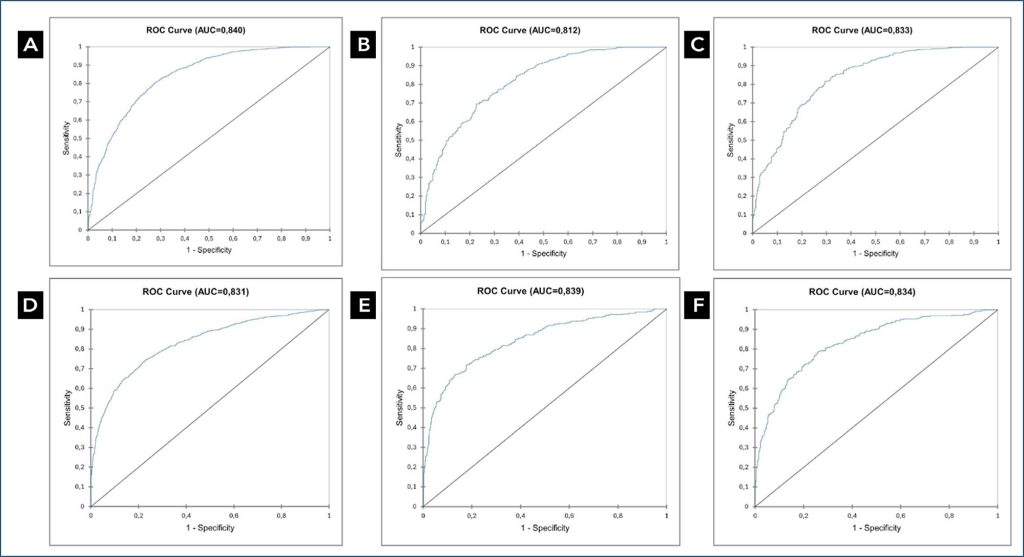 A regressão logística apresentou sensibilidade de 55,05%, especificidade de 91,32% e AUC 0,833; a máquina de vetor de suporte obteve 47,82%, 93,01% e 0,834. Para malformações oftalmológicas congênitas de difícil diagnóstico, a regressão logística alcançou AUC 0,795 e a máquina de vetor de suporte 0,842. Para condições rastreáveis, a regressão logística obteve AUC 0,790 e a máquina de vetor de suporte 0,761.