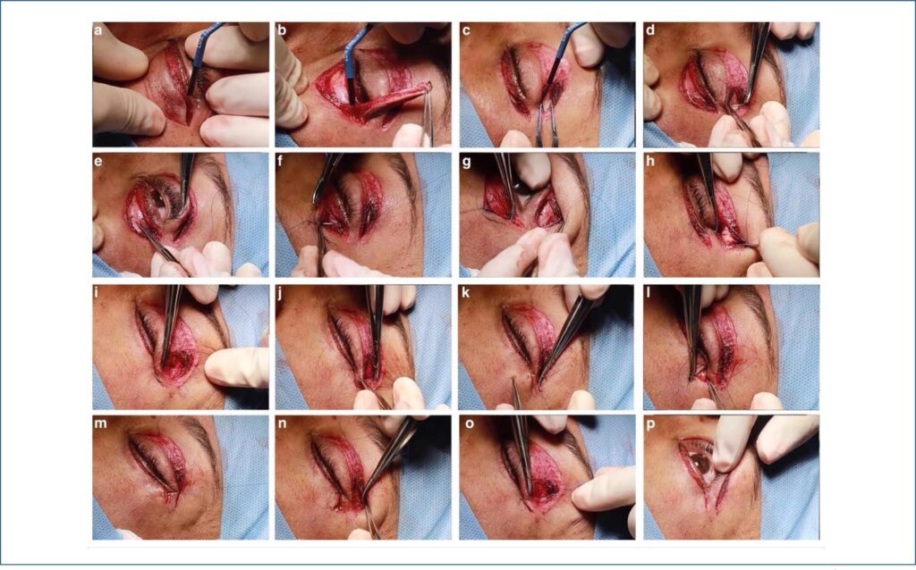 Descrever a técnica de blefaroplastia superior e inferior associada à cantopexia associada à dupla elevação do músculo orbicular pré-septal em uma única sutura e avaliar sua eficácia.