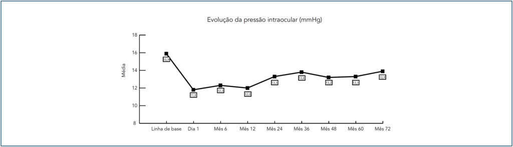 Foram identificados 214 olhos. O tempo médio de seguimento foi 38,4 meses. A pressão intraocular média pré-operatória era de 16,0mmHg e, no fim do acompanhamento, de 13,6mmHg (p<0,001). No fim do acompanhamento, 75,7% dos olhos estavam com pressão intraocular <18mmHg, sem necessidade de medicamentos para glaucoma. Nos dois grupos, entre o pré-operatório e o fim do acompanhamento, houve melhora significativa da acuidade visual e do equivalente esférico; porém a proporção de independência dos óculos foi significativamente maior no grupo submetido à lente intraocular multifocal.