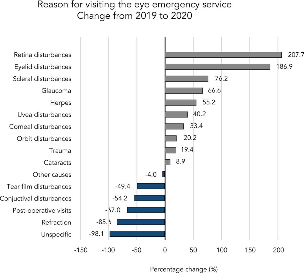 Houve redução de 52,1% no número de atendimentos oftalmológicos de emergência durante o período pandêmico (n=9.198) quando comparado ao pré-pandêmico (n=19.220), com reduções significativas em casos inespecíficos (-98,1%), visitas pós-operatórias (-67,0%), distúrbios da conjuntiva (-54,1%), filme lacrimal (-49,4%) e refração (-85,6%) durante o período de pandemia. Condições como distúrbios da retina (+202,7%), distúrbios da esclera (+76,2%), distúrbios da órbita (+20,2%), glaucoma (+66,6%) e trauma (+19,4%) apresentaram taxas aumentadas, bem como aquelas relacionadas a pálpebras (+186,9%), córnea (+33,4%), úvea (+40,2%) e herpes (+55,3%).