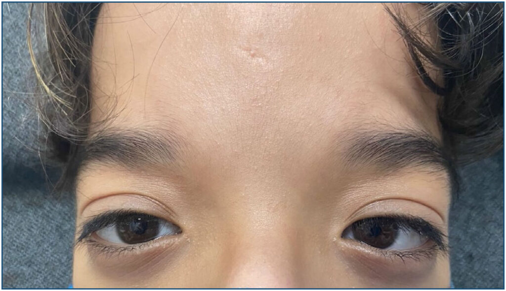 Paciente do sexo masculino, 12 anos, com diagnóstico intrauterino de síndrome de Donnai-Barrow, apresentava ao exame oftalmológico esotropia, alta miopia, nistagmo e estafiloma de disco óptico. Associado ao quadro, apresentava síndrome de Falconi e perda auditiva neurossensorial, além de alterações faciais, como hipertelorismo, inclinação inferior das fissuras palpebrais e implantação baixa das orelhas. Ressonância magnética revelou agenesia de corpo caloso. Ao nosso conhecimento, este é o primeiro caso relatado associando esotropia, nistagmo e estafiloma de disco óptico.