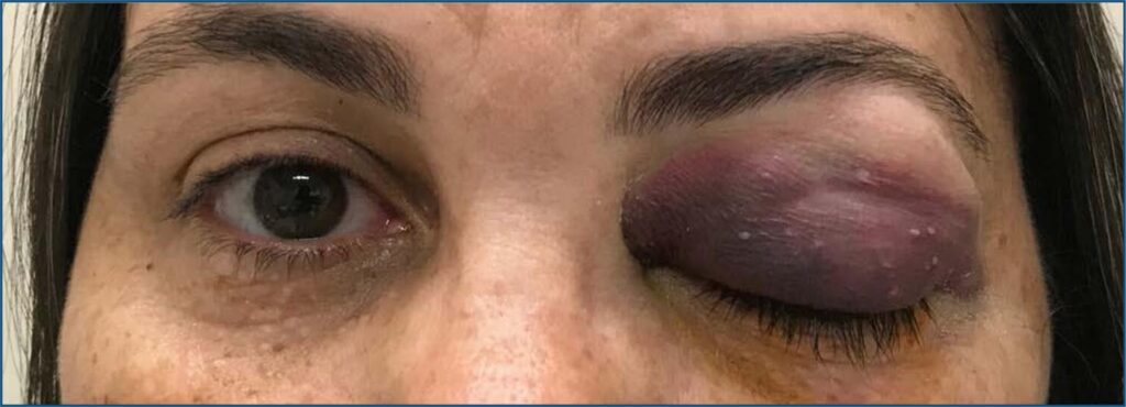 Os diagnósticos diferenciais que compõem as proptoses agudas são, muitas vezes, desafiadores. A anamnese e o exame clínico exigem do oftalmologista atenção especial aos detalhes que permitem diferenciar quadros relativamente benignos e autolimitados de quadros que evoluirão com incapacidades permanentes. Relatamos o caso de uma paciente de 49 anos que, durante viagem de avião, apresentou dor ocular, hematoma periorbitário e proptose do olho esquerdo súbitos. Referia diplopia aguda incapacitante. Exames de tomografia e angiorressonância magnética confirmaram diagnóstico de sinusopatia do seio etmoidal esquerdo e hematoma subperiosteal da órbita esquerda, associado ao barotrauma. Apesar de raro, o diagnóstico de hematoma subperiosteal não traumático deve ser considerado diferencial em relação a proptoses agudas, sendo a anamnese fundamental para essa elucidação diagnóstica.