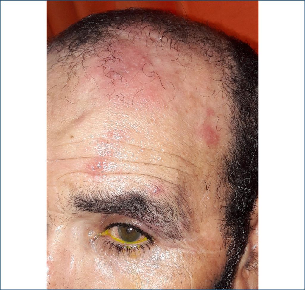A 62-year-old healthy man with left-sided headaches for 3 days and redness of the left eye for 24 hours. The best corrected visual acuity of both eyes was 10/10. The left side of the forehead showed incipient vesicles on an erythematous background (). The left eye was slightly injected. Biomicroscopic examination disclosed a large temporal corneal pseudodendrite (). Fluorescein staining under a cobalt-blue filter confirmed this pattern (). Valacyclovir associated with lubricant eyedrops was started. Follow-up examination revealed complete resolution of symptoms and no corneal sequelae; the visual acuity was unaffected.