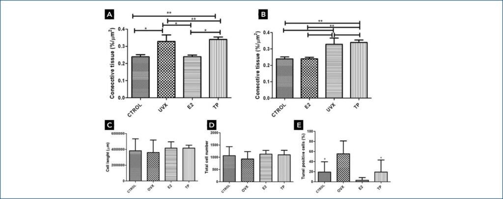 O conteúdo de colágeno diminuiu significativamente no grupo de ovariectomizadas em comparação com o controle, destacando a importância da integridade tecidual. O volume celular aumentou nos grupos de ovariectomizadas com reposição de estrogênio e com reposição de fitoestrógeno, indicando influência hormonal. Os níveis de apoptose variaram, com níveis mais altos nos grupos de ovariectomizadas e de ovariectomizadas com reposição de estrogênio, enquanto o de ovariectomizadas com reposição de fitoestrógeno se assemelhou ao grupo controle.
