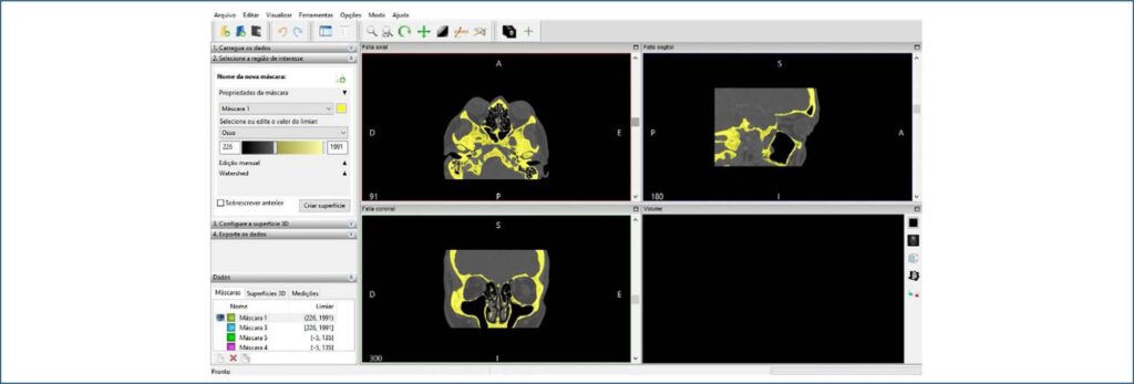 Foram utilizadas imagens em formato DICOM provenientes de dois exames de tomografia computadorizada de órbitas para a impressão tridimensional. Para manuseio das imagens, foram utilizados o InVesalius®, versão 3.1.1, para delimitar e limpar a estrutura de interesse e também para converter em formato STL. O Blender®, versão 2.80 foi usado para refinamento. A imagem em STL foi então enviada para o programa Repetier-Host, versão 2.1.3, que divide a imagem em camadas e gera as instruções para impressão da peça em ácido polilático na impressora tridimensional.