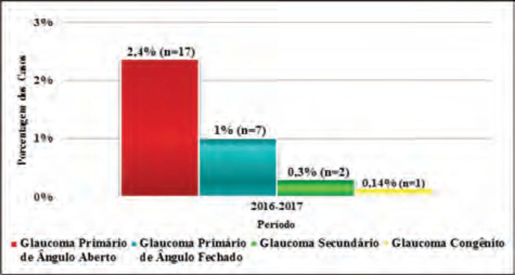 O estudo encontrou uma prevalência de 6% (n=43), distribuída em 6,8% (n=21) em 2016 e 5,4% (n=22) em 2017. Quanto ao gênero, a maior parte correspondeu ao sexo feminino (53,5%, n=23) e 46,5% (n=20) ao sexo masculino. O Glaucoma Primário de Ângulo Aberto demonstrou maior prevalência, acometendo 2,5% (n=18) dos pacientes. A faixa etária demonstrou predominância do público acima dos 40 anos, 96% (n=24) dos 25 com a idade disponibilizada. Também foi observado que 42% manifestavam hipertensão arterial isoladamente, 2% diabetes mellitus isoladamente, 5% combinação entre as duas e 51% não possuíam nenhuma comorbidade.