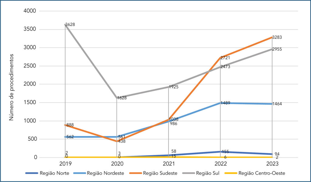 A análise revelou uma execução desigual das triagens para discromatopsia e baixa acuidade visual no território nacional, indicando possíveis vieses na interpretação das dificuldades de realização dos testes ou na subnotificação dos procedimentos. Observou-se também que o teste de Snellen é realizado três vezes mais frequentemente que o de Ishihara, levantando preocupações quanto ao diagnóstico tardio de discromatopsias.