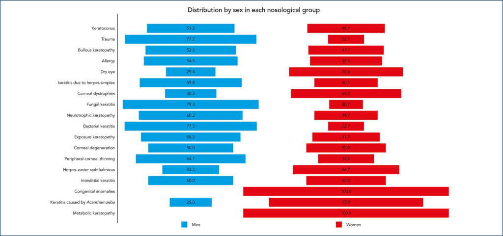 Foram analisados os prontuários de 3.079 pacientes, dos quais 52,7% eram homens. Na amostra estudada, 31,9% apresentavam diagnóstico de ceratocone, 9,2% sofreram trauma ocular e 7,8% exibiam ceratopatia bolhosa. O ceratocone foi mais prevalente entre indivíduos de 11 a 40 anos, sem diferenças significativas entre os sexos (p = 0,283). O trauma ocular, assim como a ceratite bacteriana e fúngica (p = 0,001 e p < 0,001, respectivamente), foi mais comum em homens (p < 0,001) na faixa etária de 41 a 50 anos. No entanto, a síndrome do olho seco e as distrofias corneanas foram mais prevalentes em mulheres (p < 0,001 para ambos). A ceratopatia bolhosa foi o diagnóstico mais prevalente em pacientes com 51 anos ou mais, sem distinção entre os sexos (p = 0,886). As principais causas para indicação de transplante foram ceratocone (31%), úlcera (21,7%) e trauma (15,5%).