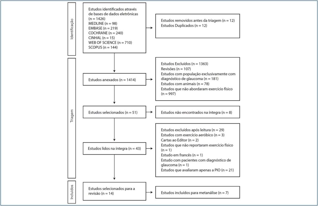 As recomendações do Preferred Reporting Items for Systematic Reviews and Meta-Analyses foram utilizadas. As buscas foram realizadas nas bases de dados MEDLINE®, Embase, Cochrane, Cinahl, Web of Science e Scopus. Estudos que avaliaram a pressão de perfusão ocular antes e após o exercício físico foram incluídos. O risco de viés foi analisado pela Quality Assessment Tool for Before-After (Pre-Post) Studies with no Control Group. Metanálises de efeitos aleatórios foram conduzidas para determinar o efeito do exercício físico de handgrip e agachamento na pressão de perfusão ocular.