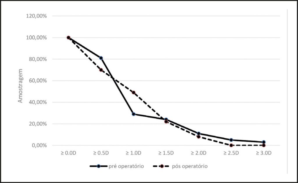 Dentro de nossa amostra composta por 37 olhos abordados com assistência do VERION®, 43% dos participantes do estudo (n=16) apresentaram redução do astigmatismo inicial, inclusive com eliminação de graus mais graves de astigmatismo (≥2.5 D).