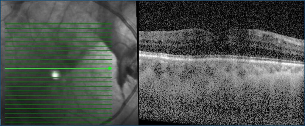 A 10-year-old Malay girl with underlying HbE/beta-thalassemia, on regular blood transfusion and deferoxamine iron chelation therapy, presented with two-month history of bilateral blurring of vision. On examination, her vision was 6/36 both eyes. Other optic nerve functions were normal. Anterior segment examination of both eyes was unremarkable. Fundus examination of both eyes revealed dull foveal reflex. Optical coherence tomography of both maculae showed increased central subfield thickness. Fundus fluorescence angiography showed patchy hypofluorescence over macular region for both eyes and late staining, indicating retinal pigment epithelium anomalies. A diagnosis of iron-chelation-therapy-related bilateral maculopathy was made. Patient was co-managed with pediatric hematology team to adjust the dose of deferoxamine, and was given three monthly appointments to monitor the progression of maculopathy at the ophthalmology clinic. However patient defaulted ophthalmology follow-up after the first visit.