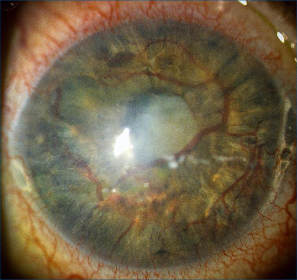 Exuberant iris rubeosis in the right eye of an 83-year-old patient, with development of total cataract, after central venous occlusion. The intraocular pressure was 48 mmHg. Despite complaints of progressive painless hypovision for several years, it was the first ophthalmological observation of the patient, who was surprised by this eye’s poor visual prognosis.[1–4]
