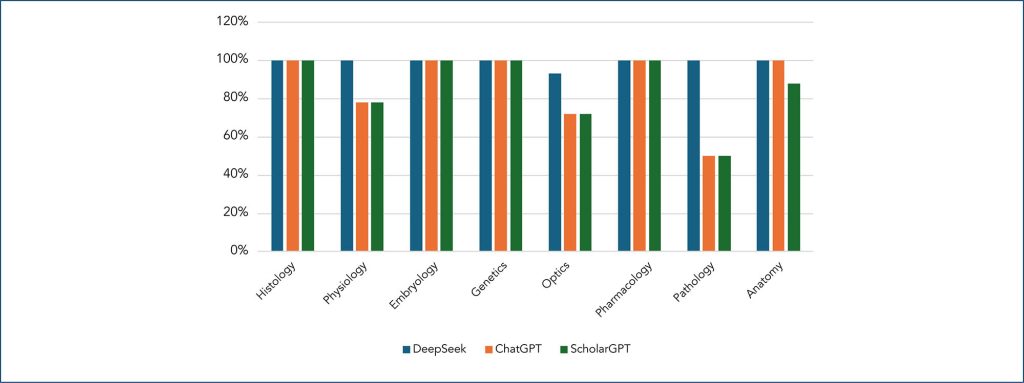 DeepSeek achieved the highest performance, with an accuracy rate of 97.8% in theoretical exam I and 81.9% in theoretical exam II, consistently outperforming the other models across all knowledge areas. ChatGPT demonstrated intermediate performance, while Scholar GPT had the lowest accuracy rate.