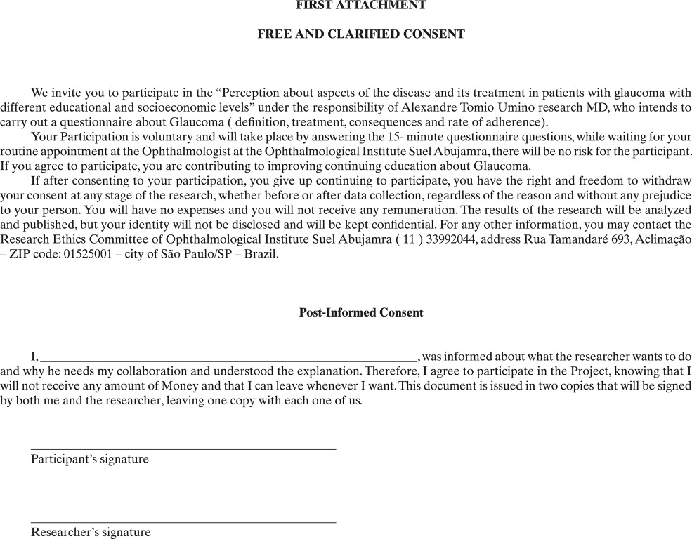 A cross-sectional analytical study was carried out applying structured questionnaires based on an exploratory study to assess the level of Glaucoma patients’ knowledge relationated with the disease in two different audiences: the single health system (SUS) and private health plans. The questionnaires were used by doctors residents in Ophthalmology. A sample was composed of 202 patients among which 100 were attended by SUS and the others 102 patients were holders of private health plans. All questionnaires have a free and informed consent form signed by the participant and the responsible researcher.