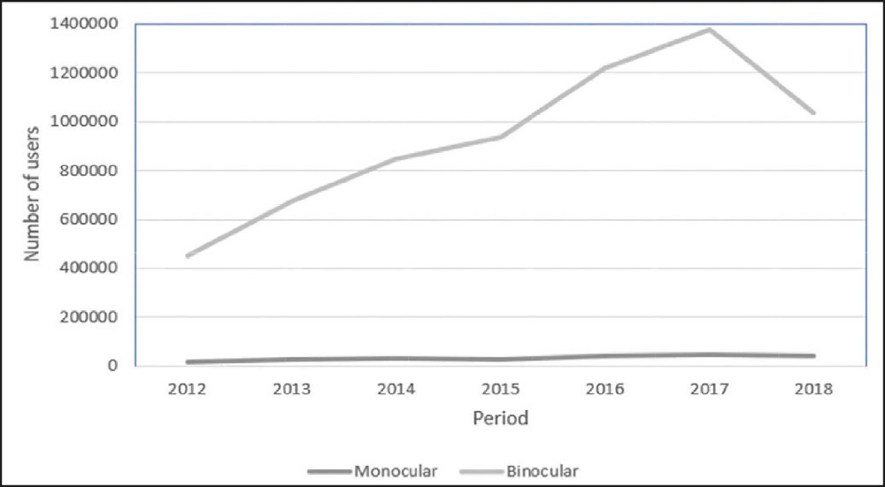 A quantitative and descriptive study was conducted using available data based on the outpatient information system from SUS (SIA/SUS, acronym in Portuguese). The variables were monocular treatment with first, second, and third-line drugs; monocular treatment with combinations of two drugs and three drugs from different lines; binocular treatment with first, second, and third-line drugs; and binocular treatment with combinations of two drugs and three drugs from different lines.
